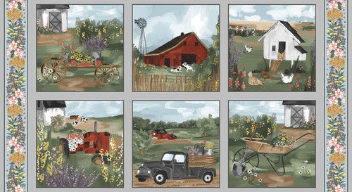 Rise with the Sun just like the chickens in this collection. Pulling up to the farm, in your pick-up truck, you are greeted by “baa-ing” goats. Out in the fields, cattle are roaming about. The windmill spins every so often indicating which direction the wind is coming from. It is a perfect day to pin up your laundry outside for it to dry. As your clothes dry in the sun, you pick wildflowers and place them in your wheelbarrow to take them inside. Rise With the Sun and get started on your next quilt with this charming collection by Laura Konyndyk.